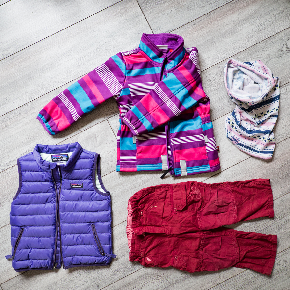 Sur cette première couche, je lui mettais des vêtements normaux (t‑shirt à manches longues, pull) puis, bien sûr, une couche chaude. Nous avions déjà une polaire, j’ai donc pris une veste Softshell Lego (ils font des bons vêtements d’hiver !) ainsi qu’une doudoune sans manche enfant Patagonia.