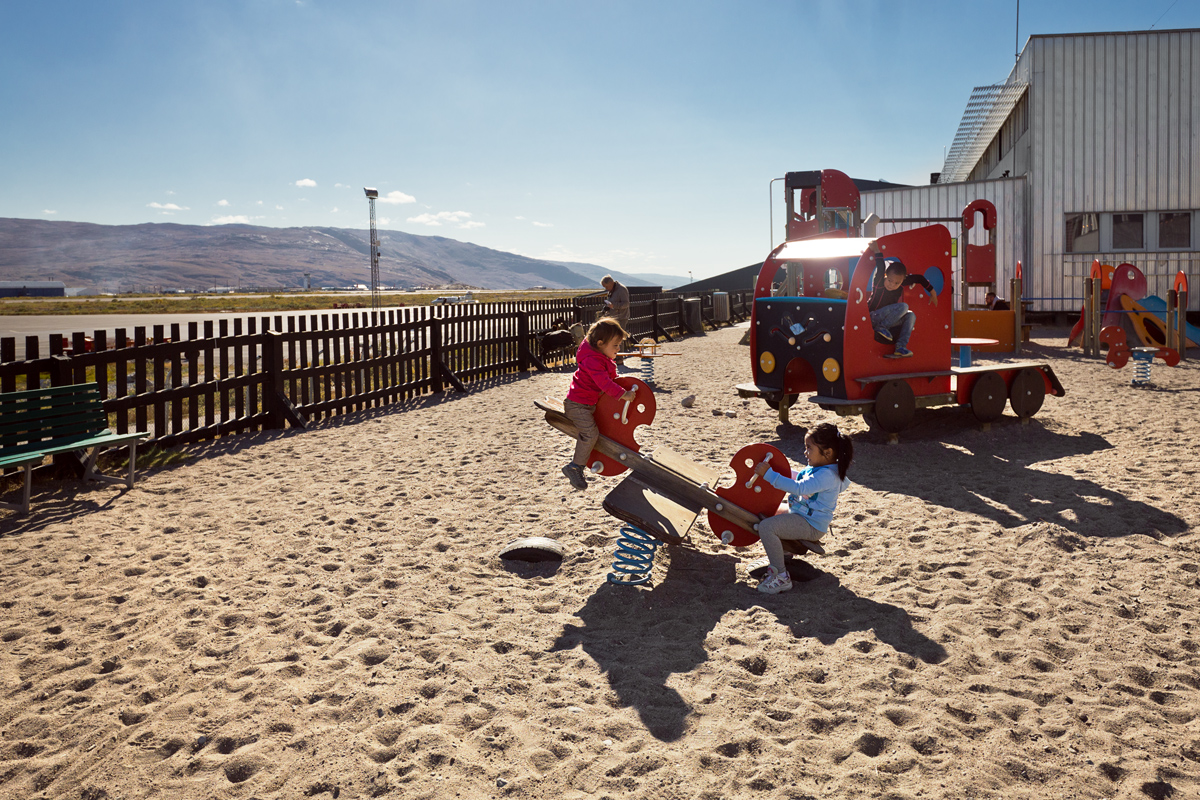 Il y a des jeux pour enfants absolument partout. Dans chaque quartier des « grandes » villes, dans chaque village, chaque aéroport. Oui, à l’aéroport. A Kangerlusuaq, l’aéroport où se font la plupart des connections du Groenland, il y a ainsi une grande dînette à l’intérieur et toute une aire de jeu dehors, avec vue sur les avions. Du coup, non seulement ils ne s’ennuient pas pendant la correspondance, mais en plus ils se défoulent !