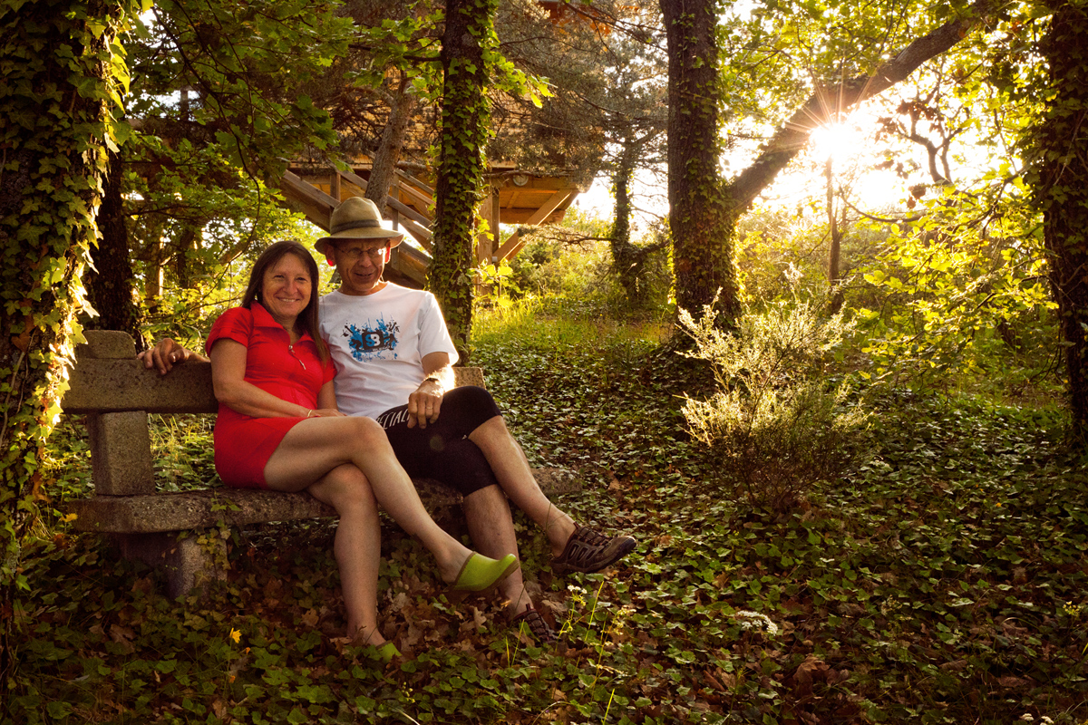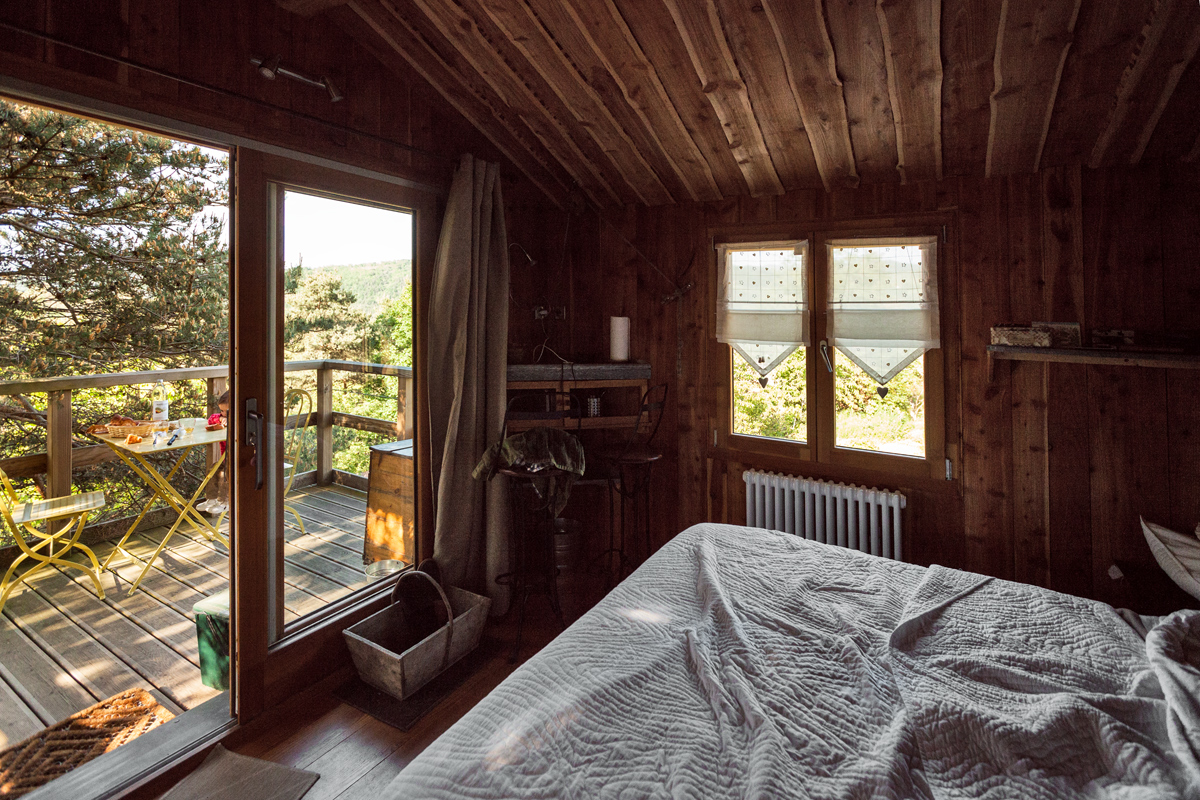 Naturellement, quand ils ont décidé de faire des hébergements, ils ont fait ce qui leur ressemblait. Francis est un bricoleur passionné de nature et de récup ». Dans la cabane perchée qu’il a construite, on trouve donc une douche dans une ancienne cuve (qui servait pour la fourme), un morceau de tronc d’arbre troué par un pic transformé en table de nuit lumineuse, et plein d’astuces pour aménager l’intérieur sans empiéter sur l’espace.