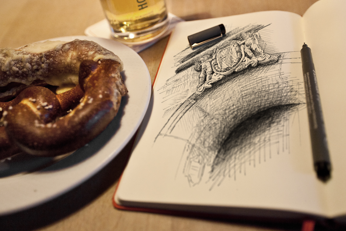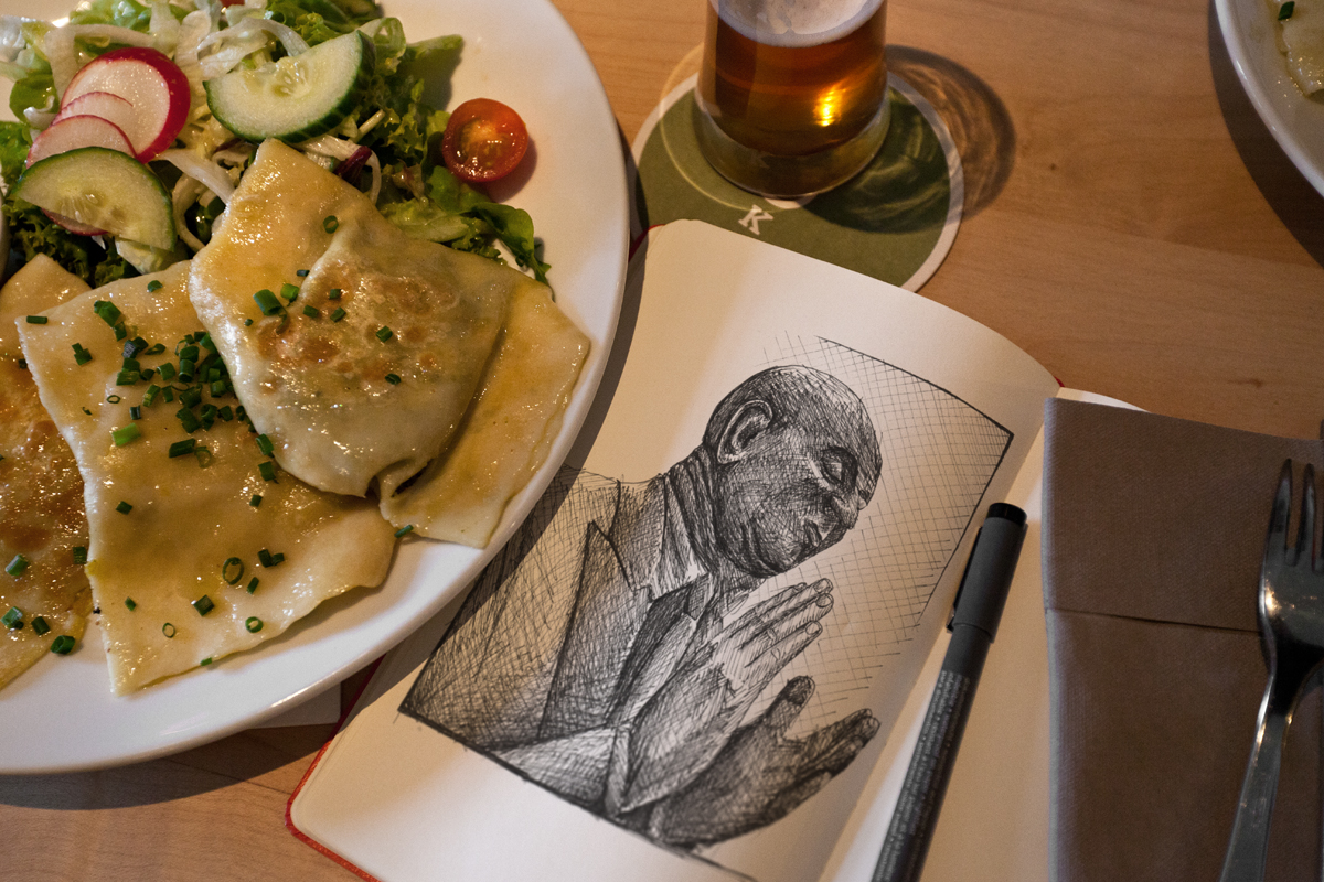 Le Bade-Wurtemberg a parmi ses spécialités les Maultaschen, des ravioli fourrés. On les trouve un peu partout, généralement à la viande mais l’option végétarienne est presque systématiquement disponible. Et à côté, sur le carnet, j’ai croqué « Die Claque », une des quatre sculptures de Guido Messer (un argentin qui a étudié l’orfèvrerie à Pforzheim, avant d’aller faire les Beaux-Arts à Stuttgart), représentant des hommes en train d’applaudir. On trouve des œuvres d’art un peu partout dans Pforzheim, une façon de se réapproprier la ville, sans doute.