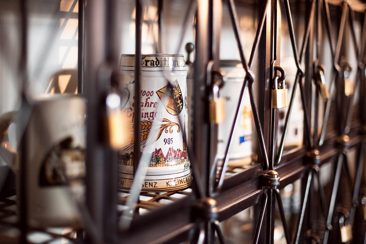 Au Schloßkeller, il y a les habitués. Vous me direz que tous les bars ont des habitués, c’est ce qui fait leur chiffre d’affaire. Certes. Mais ici, les habitués laissent leur chope à demeure, dans un casier ! Ainsi, quand ils arrivent, ils peuvent aller chercher leur propre récipient pour le faire remplir. Ce serait dommage de boire sa bière dans la même pinte que tout le monde !