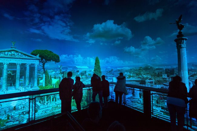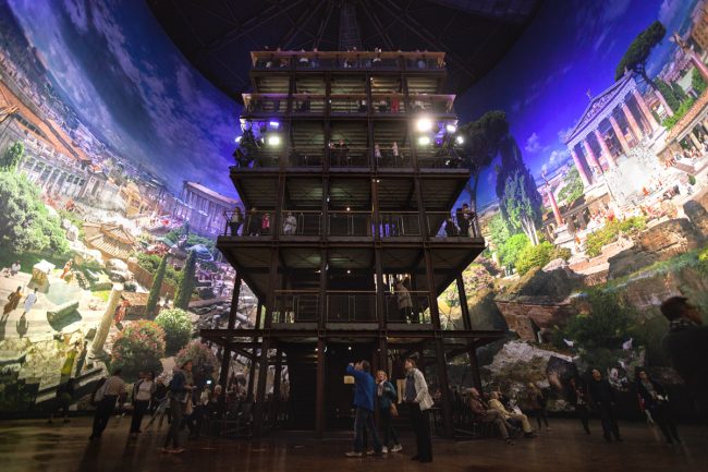 Lors de ma visite, le panorama à 360° plongeait les visiteurs dans la Rome de l’an 312. Le concept de Yadegar Asisi est de dérouler un gigantesque montage photo, imprimé sur des toiles tendues tout autour d’une tour d’observation (faut pas regarder de trop près...). On peut alors se déplacer pour observer tous les détails, à la manière d’un Où est Charlie. Les jeux de lumière et les bruitages rendent le tableau vivant : les coqs sur la lumière dorée, la vie bouillonnante au zénith, le calme apparent de la nuit bleutée.