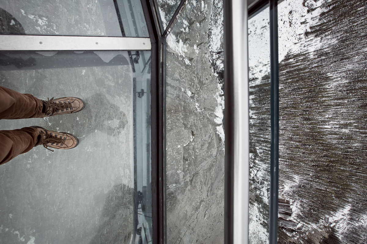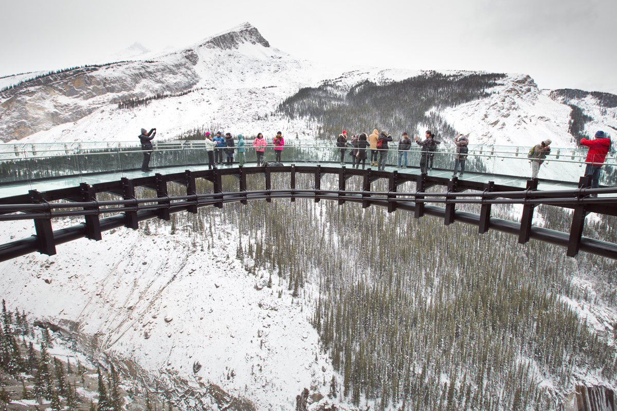 Le tram­way aérien nous dépose dans un bati­ment cou­vert où l’on peut se réchauf­fer, mais d’où on peut aus­si par­tir explo­rer les alen­tours. Une pas­se­relle en bois per­met un petit tour en toute sécu­ri­té pour les jours de tem­pête de neige ! Et le pano­ra­ma sur les mon­tagnes, les lacs et la ville de Jas­per en bas, et bien sûr à coupe le souffle !