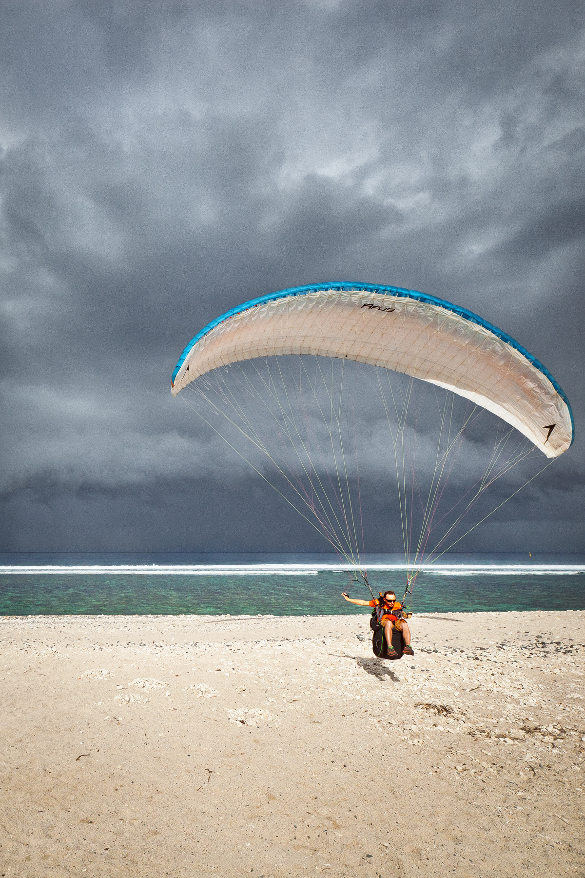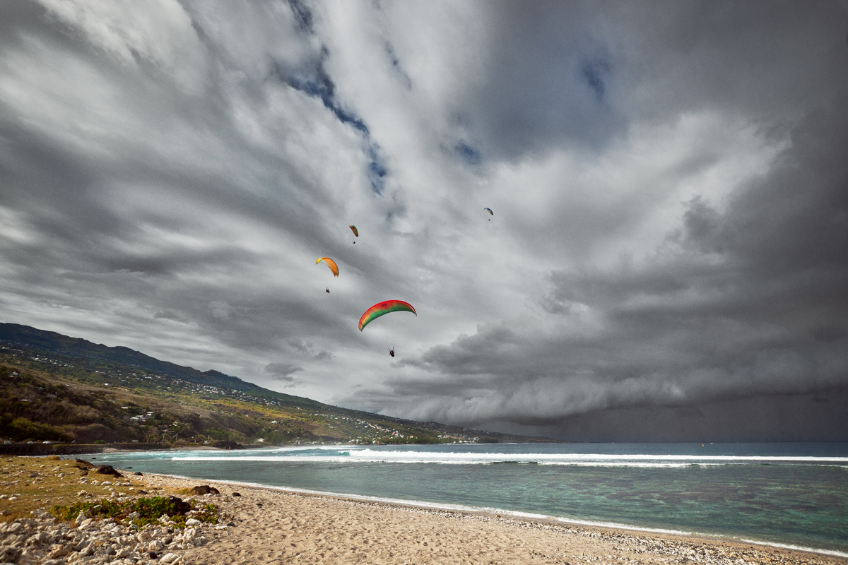 Le parapente était parmi les activités qui me faisaient le plus saliver sur le programme, Saint Leu étant l’un des meilleurs lieux pour un baptême. Manque de bol, pour plusieurs raisons, ce ne sera pas possible. Mais j’ai quand même passé une bonne heure à les regarder atterrir sous l’orage. Les moniteurs avaient beau sourire,on sentait tout de même une certaine tension : ils attendaient trois de leurs collègues, qui ne sortaient pas des nuages. Le vent s’était levé, les nuages étaient bas, et pour les trois touristes en baptême, ce devait être impressionnant. Ils ont fini pas apparaître, atterrissant dans les hauteurs, loin de la plage mais sains et saufs.