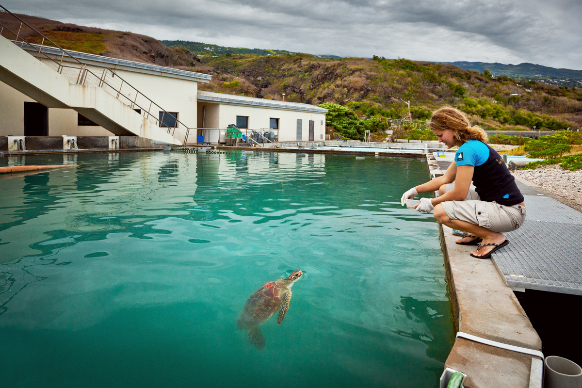 Nous rencontrons Mathieu, responsable de toute la partie « soins des tortues » depuis 2010. Il a, avec lui, six soigneurs pour s’occuper de 70 tortues. Il nous explique qu’il travaille beaucoup avec les pêcheurs. Ceux-ci ramènent les tortues qui se prennent dans leurs hameçons. Parfois, le crochet se sera « juste » planté dans la bouche. D’autres fois, il sera allé jusqu’à l’œsophage... Dans tous les cas, ils feront tout ce qui est possible pour sauver la tortue. Si elle survit, elle restera un temps en observation dans les bassins de Kelonia, avant d’être relâchée, comme une trentaine de ses congénères chaque année.