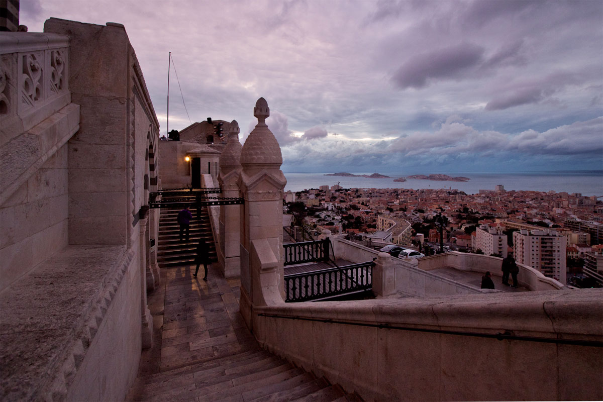 Nous grimpons les marches pour une vue panoramique sur Marseille et la mer, toute proche. La lumière est étrange, je ne sais pas si c’est habituel ici, mais elle n’a rien à voir avec une fin de journée parisienne.