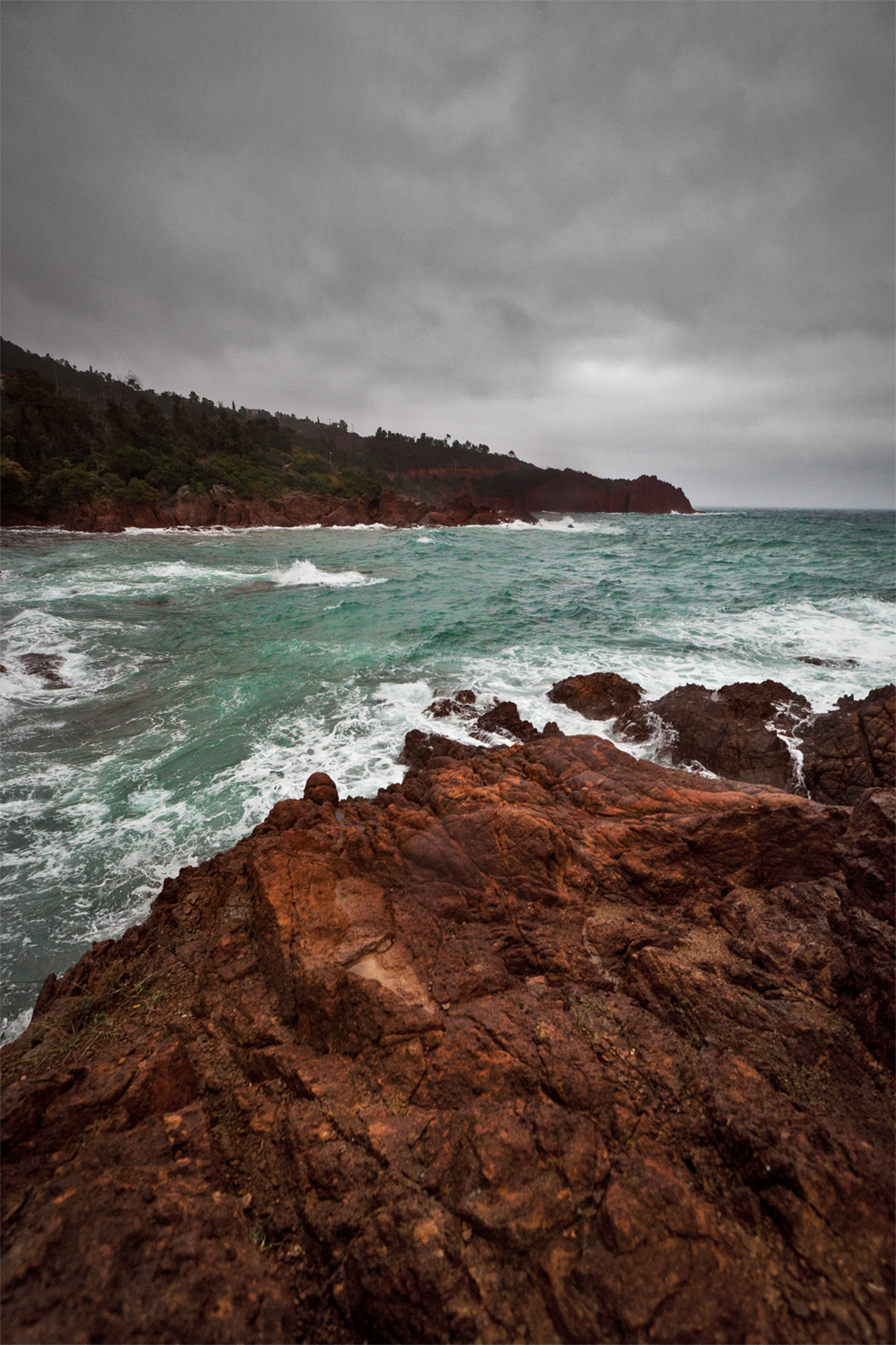 Notre train est à 16h à Saint-Raphaël ; nous partons dans cette direction, espérant retrouver un peu de soleil, ou au moins quitter l’averse. Nous passons devant l’entrée de la route des Crêtes. Un panneau indique qu’elle est fermée. Entre le vent et la pluie, y conduire serait sacrément dangereux.