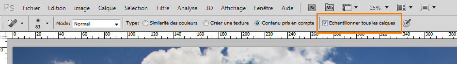 De base, cet outil ne permet pas de travailler sur un calque vide. Il faut cocher une case : « échantillonner tous les calques » pour qu’il analyse l’ensemble des calques inférieurs et agisse sur notre nouveau calque.