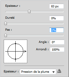 Les réglages disponibles sont les mêmes que pour le pinceau, entre autres. L’épaisseur va correspondre à la grosseur de la forme utilisée : elle doit être légèrement plus large que ce que l’on va effacer, mais pas trop non plus. La dureté définit la douceur des bords ; pour une meilleure intégration de la texture de remplacement, il vaut mieux des bords assez flous, et donc une dureté au minimum (vous suivez toujours ?). Les autres paramètres ne nous intéressent pas vraiment.