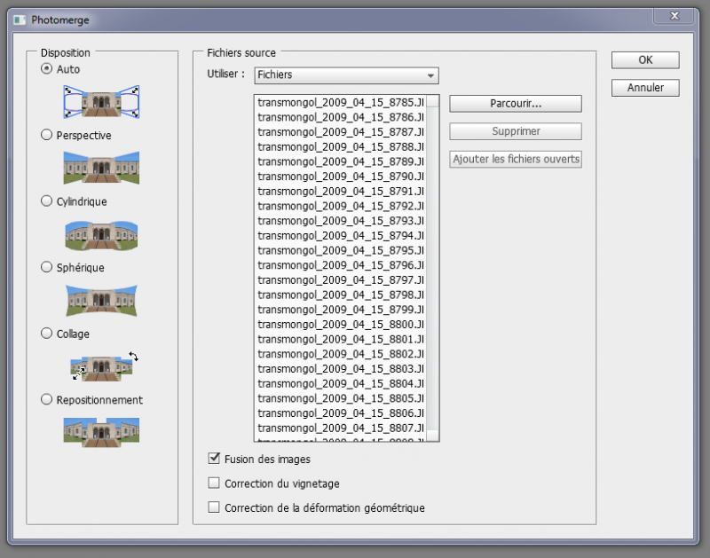 Sous Photoshop, c’est très simple. Vous allez trouver « Photomerge » dans Fichier > Automatisation. Le petit menu est assez ergonomique. Vous chargez vos images (ou les avez déjà ouvertes) et lui dites quel type d’assemblage il faut effectuer, quitte à faire plusieurs essais.