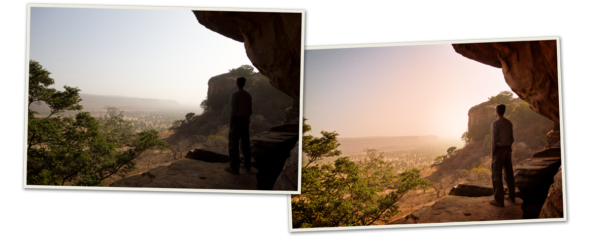 His­toire d’illus­trer l’im­por­tance du post-trai­te­ment, j’ai envie de vous mon­trer deux exemples, pris le même jour, au Mali. Il y a eu une vague de « froid » et un brouillard voi­lait tous les pay­sages sur la fin de notre voyage. Or, à l’in­verse de la pluie, il est dif­fi­cile d’al­ler faire un gros plan sur de la brume. Il faut donc prendre sa pho­to en essayant de pen­ser à ce que ça pour­ra don­ner une fois développé.