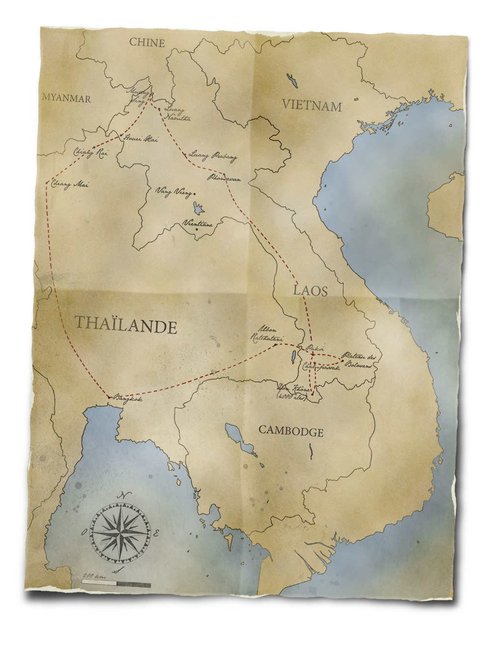 J’ai repris feu la carte que j’a­vais des­si­née pour le Viet­nam, qui était assez large pour ser­vir à ce voyage-ci. Voi­ci donc un essai d’i­ti­né­raire... Dans la théo­rie, c’est fai­sable en trois semaines sans cou­rir, en pre­nant en compte la rapi­di­té des trans­ports locaux et en lais­sant deux jours de marge, des fois qu’on ait un pépin. Mais si gros retard il y avait, hé bien, il suf­fi­rait de faire sau­ter les der­nières étapes (mais pas le pla­teau des Bolovens !).