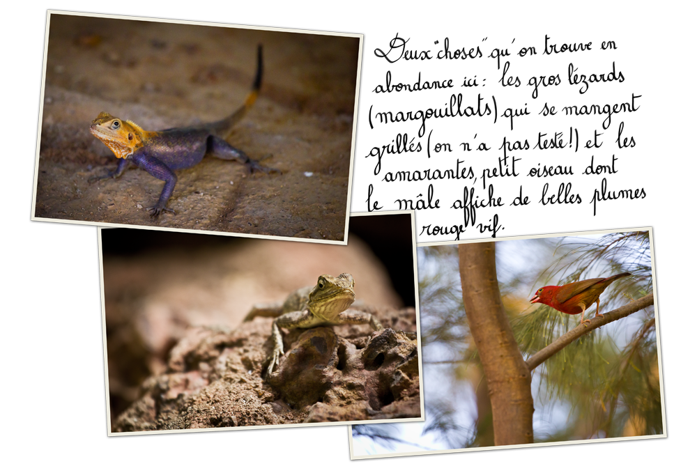Adeline : un jour où on se baladait le long du Niger, on a vu cinq ou six ados qui s’agitaient en lançant des pierres et en criant autour d’un truc. La scène était assez impressionnante ! On est resté en retrait le temps de comprendre : l’un d’eux venait d’attraper le lézard pour lui assener de nouveaux coups. Mine de rien, ça peut faire jusqu’à 40 cm... Quand on est repassé un peut plus tard, ils étaient en train de l’ouvrir... et franchement, ça n’était vraiment pas tentant !