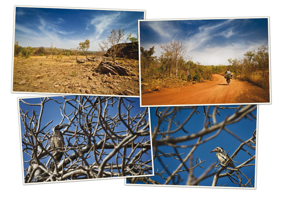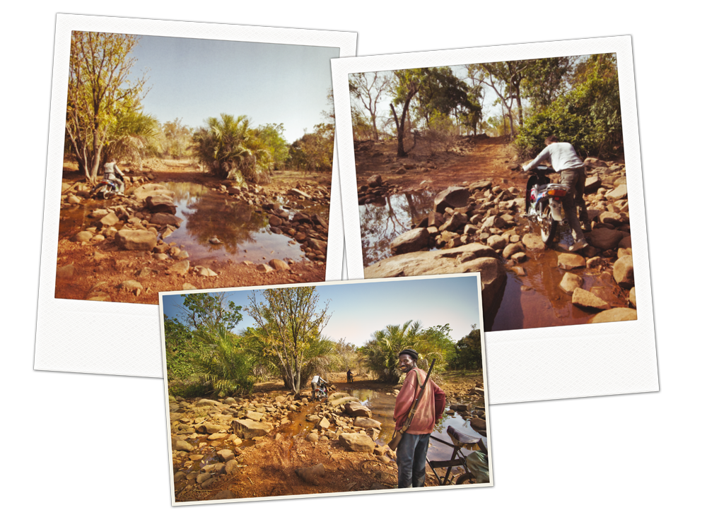 En fait de moto, il s’agit d’un scooter chinois, le même que 90% des maliens (et thaïlandais, et laotiens, ...) à 100cc. Nous voulons aller à Djendjeni, la cascade, un petit îlot de paradis où l’on peut se rafraîchir. Dit comme ça, ça a l’air chouette, mais on va devoir le mériter : deux heures de cailloux, la pédale du frein qui se brise dès le début, et aucun panneau, sauf un, à la fin, qui indique... autre chose : le village d’à côté qui cherche ainsi à profiter des touristes en leur vendant des bijoux. Ce qui est idiot, d’ailleurs, parce qu’un simple stand de nourriture aurait eu beaucoup plus de succès mais il n’y a rien à manger là-bas.
