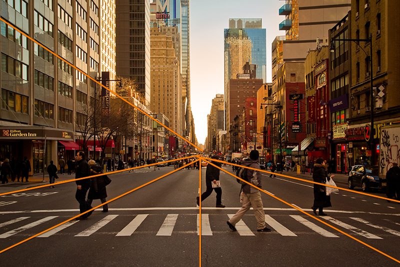 Ainsi, même avec un point de fuite centré, on retrouve tout de même parfois cette fichue règle des tiers, puisque les proportions 1/3 goudron et 2/3 ciel et grattes-ciels sont globalement respectées.