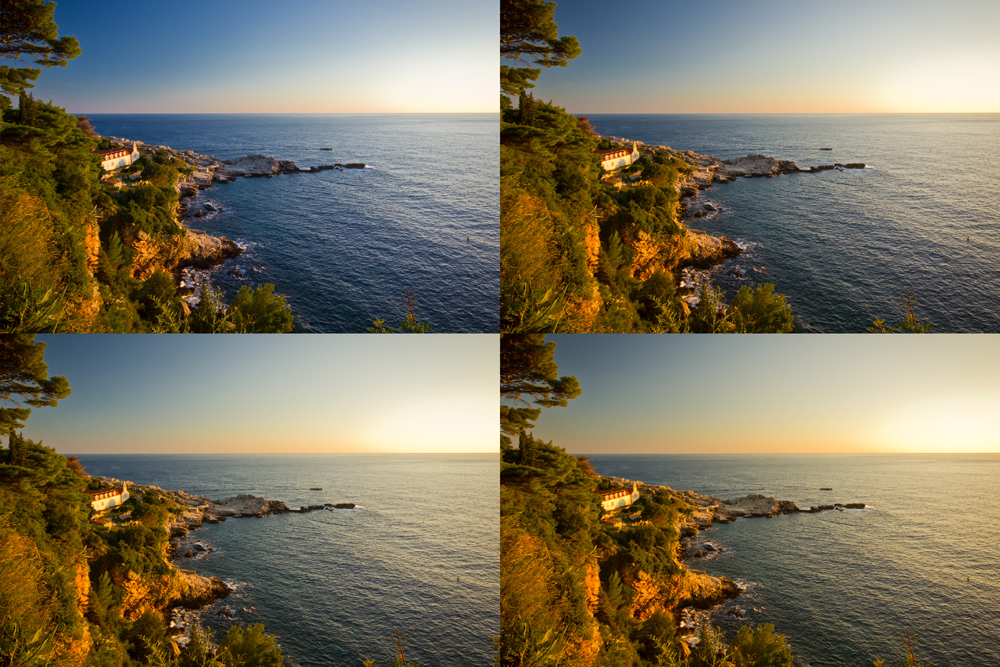 Si vous shootez en raw, vous pourrez modifier ce paramètre au développement, et donc la laisser en automatique. Sur les compacts, vous aurez parfois des modes « coucher de soleil ». C’est important, puisque c’est ce qui va donner de la chaleur à l’image. Pour illustrer ça, voici le même fichier RAW dévellopé 4 fois en changeant la balance des blancs :
