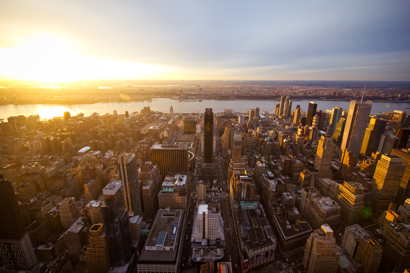 Le premier conseil serait tout simplement de ne pas utiliser le coucher de soleil pour lui-même, mais plutôt pour la lumière particulière qui fait ressortir les reliefs de n’importe quel paysage ou scène urbaine. Par exemple, ci-dessous (New York), il me semble que la partie la plus intéressante de l’image n’est pas celle de gauche, où on ne voit presque plus rien, mais au contraire celle de droite, où les ombres mettent vraiment les immeubles en valeur. D’où l’intérêt de ne pas centrer le soleil :