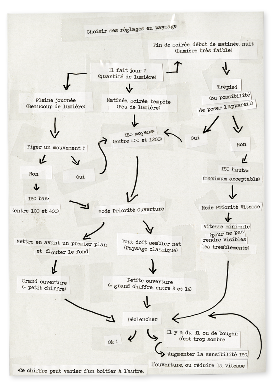 Ce tableau reprend donc grossièrement les questions que je me pose personnellement avant de prendre une photo. Il n’est pas à suivre à la lettre, bien sûr : on adapte ses réglages à ses habitudes et à son matériel.
