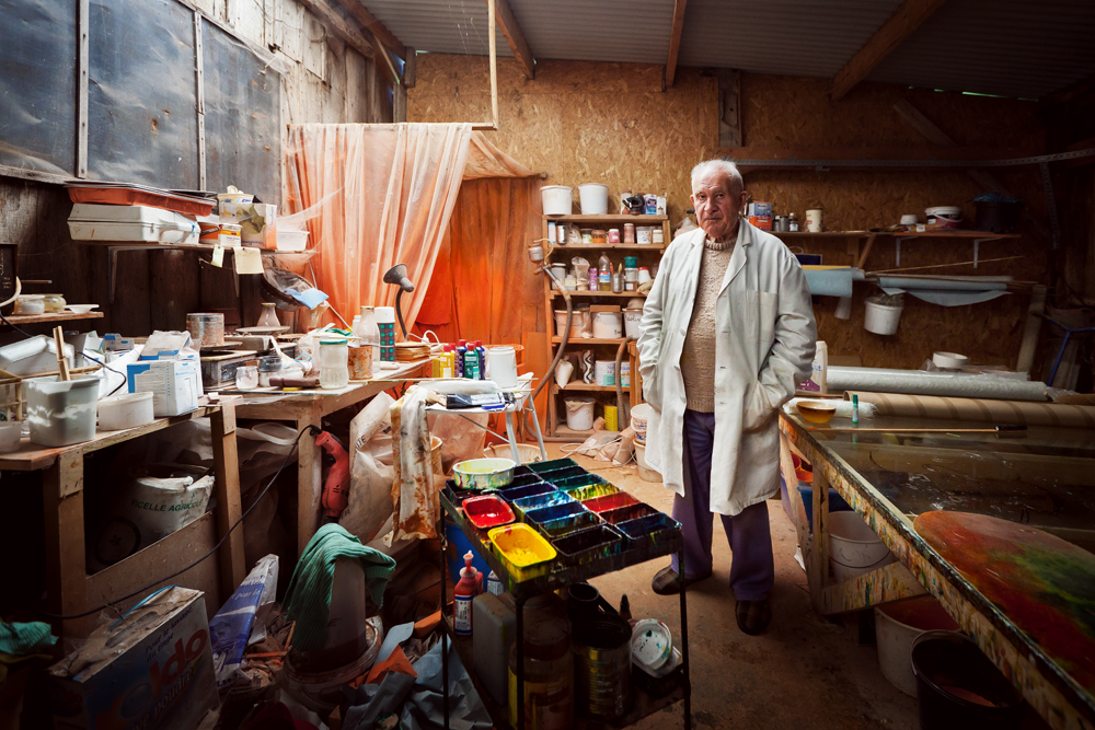 Le genre de portrait que j’aime bien faire maintenant (ici, un peintre en Mayenne), où l’ultra grand angle permet de montrer aussi l’univers du personnage.