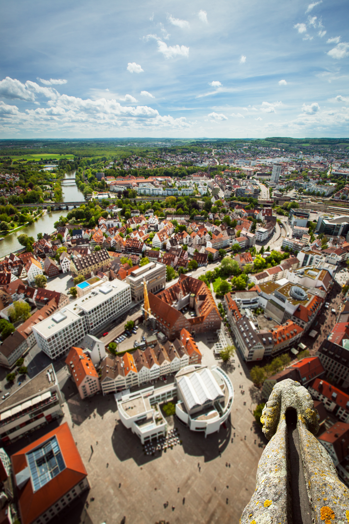 Ulm a été, comme beaucoup de villes d’Allemagne, en partie détruite pendant la guerre. Ici, ils ont choisi de reconstruire des bâtiments ultra modernes. D’en haut, on voit ainsi très bien les contrastes entre les quartiers : la Stadthaus flambant neuve jouxte le vieil hôtel de ville, la bibliothèque construite telle une pyramide transparente côtoie les colombages.